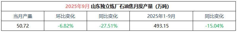 2025年9月份山东独立炼厂石油焦产量为50.72万吨,环比下降6.82%,同比下降27.51%。环比下降的主要原因是部分炼厂检修所致。1-9月份山东独立炼厂石油焦产量为493.15万吨,同比下降15.04%。