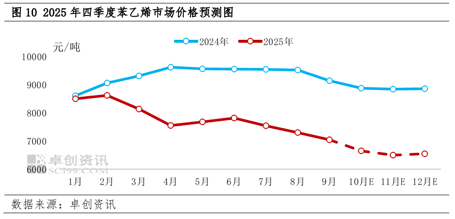 综合来看,四季度苯乙烯市场缺乏利好驱动,原料、供需基本面均相对偏弱,施压价格重心。预计10-12月均价或分别在6600元/吨、6450元/吨和6550元/吨。