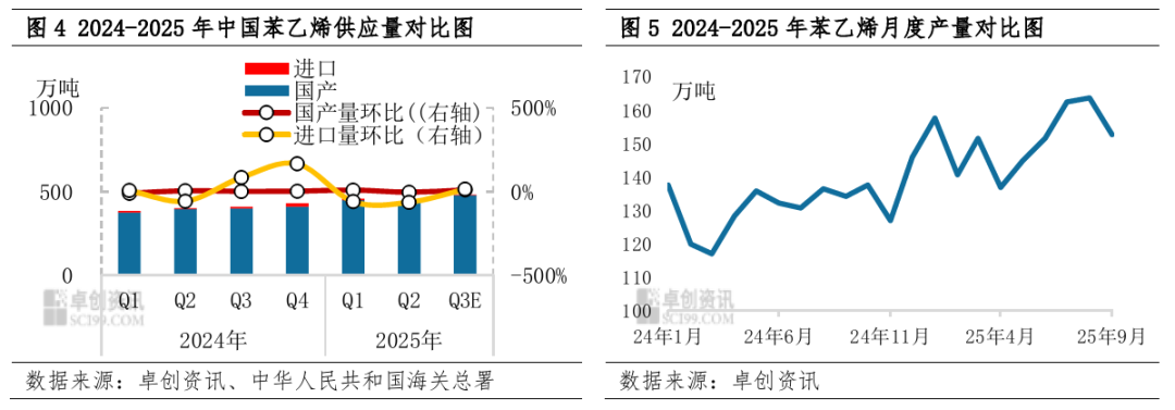 三季度国内苯乙烯总供应量环比增长11%,同比增长17.89%。总供应量的增加主要是国产量的增加,其中产量环比增加10.52%,进口量环比预计增加14.44%。虽进口增速大于国产量增速,但国产占总供应的99%。从图3也可以看出,2025年三季度是近两年供应量最高的时间,月度产量表现为先涨后跌,整体高位震荡。苯乙烯产量从二季度开始增加,三季度达到高峰,主要得益于检修装置的减少及新装置投产带来的增量,三季度投产装置有京博思达睿67万吨/年、吉林锦江石化6万吨/年。产量的高位运行促使苯乙烯主港库存快速攀升,且处于历史十年同期新高水平,也是施压苯乙烯价格走弱的主要因素。