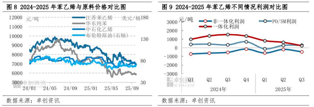 三季度原料价格下跌小于苯乙烯,故成本端非苯乙烯下跌的主要驱动。但苯乙烯价格跌幅大于原料跌幅,行业利润环比收窄。三季度来看,非一体化装置利润维持负值,季度平均利润在-468元/吨,较二季度亏损放大158.56%,PO/SM装置季度利润在293.41元/吨,较二季度略扩大3.12%,一体化装置利润均值在242.3元/吨,较二季度收窄61.96%。行业利润的收窄对于产量的影响于三季度末期显现出来,9月尤其北方装置开始官宣降负荷生产,但降负影响的产量有限,并未对苯乙烯价格起到提振作用。