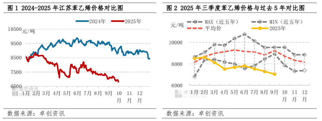 2025年三季度国内苯乙烯市场表现为持续弱势下跌,江苏苯乙烯三季度均价为7289.07元/吨,环比下跌4.92%,同比下跌22.50%,季度内各月均价均处于历时五年同期新低。7月随着港口开始宽幅累库压力下价格重心下跌;8月中上旬维持区间震荡,下旬跌幅放大,主要是回吐宏观驱动带来的涨幅;9月宽幅下跌,主要是基本面转弱驱动,山东新装置释放的增量开始影响山东及华东地区。三季度苯乙烯价格低点出现在9月30日6790元/吨,高点出现在7月10日7760元/吨。