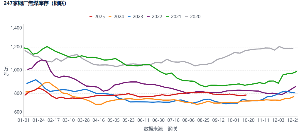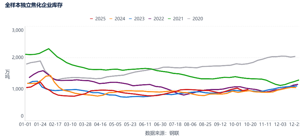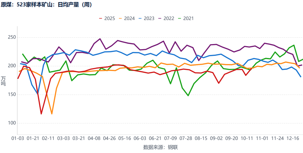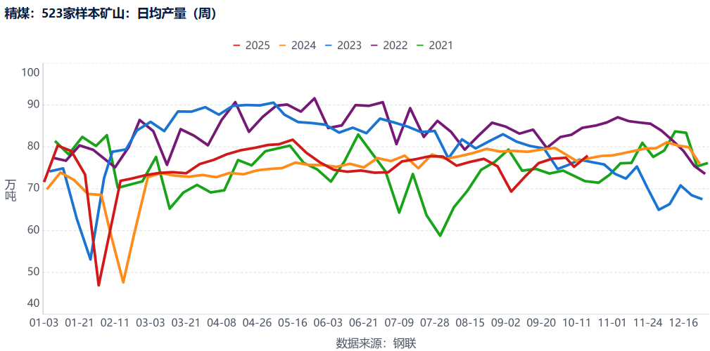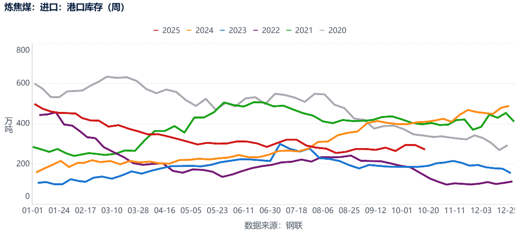 (3)煤矿生产基本持稳,铁水产量维持相对高位,下游焦钢企业对炼焦煤需求仍有支撑,但因终端需求预期偏弱,整体采购维持刚性。本周,独立焦企炼焦煤库存环比回升至997.37万吨,钢厂炼焦煤库存微增至788.32万吨,叠加港口进口炼焦煤库存回落,综合炼焦煤库存环比回升1.46%至2479.25万吨,仍低于节前水平,同比降幅近10%。