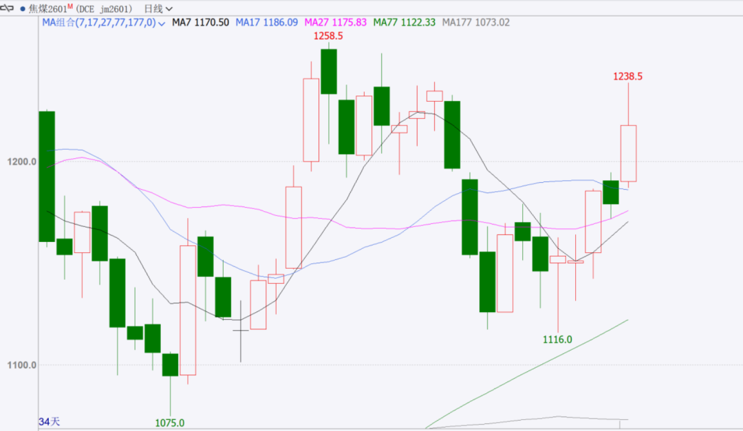 今日早盘期价短暂探涨,之后便展开震荡回落走势,截至收盘焦煤涨2.66%,报1216元/吨。