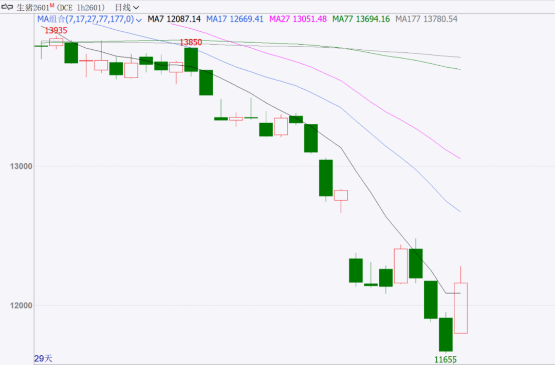 今日生猪期货价格出现较大幅度上涨,截至下午收盘大连生猪主力LH2601合约报12155元/吨,日涨340元/吨,涨幅2.88%。