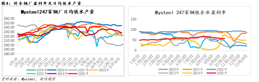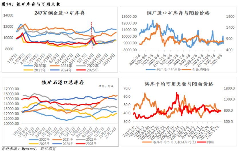 铁矿方面,钢厂维持按需采购,钢厂铁矿石库存变动不大,铁矿石港口库存延续回升态势,铁矿自身供需面有所转弱。后期需持续跟踪铁水产量下降速度。