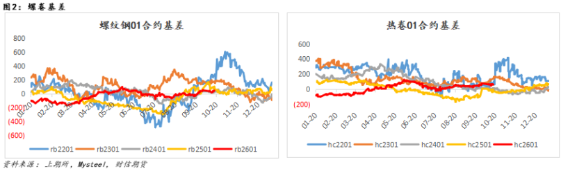 从基差角度来看,螺卷基差环比略有走扩。钢材现实驱动力有限,而预期受宏观扰动较大,螺卷01合约基差整变动不大。从螺卷01合约基差季节性走势来看,目前基差整体处于中性水平。