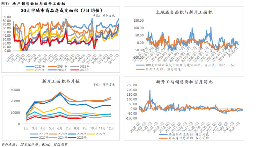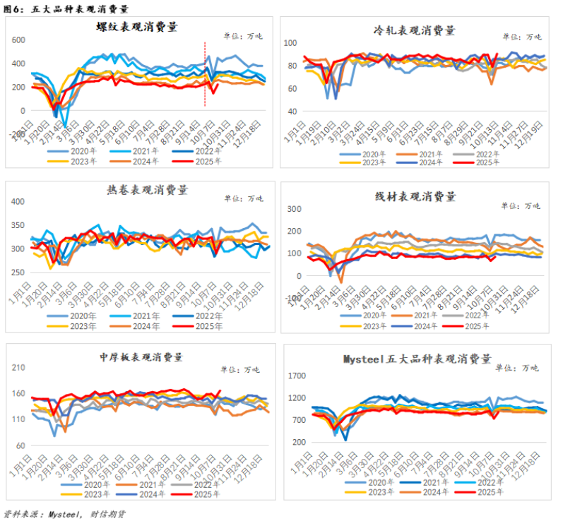 从需求表现来看(以Mysteel五大品种为例),需求环比改善,但旺季成色整体不足。据Mysteel,节假日后需求呈季节性回升,但需求同比下降态势未改(同比角度,五大产量下降幅度要小于需求同比下降幅度,供需结构整体偏弱)。从建材需求季节性角度来看,建材需求离见顶或已不远。