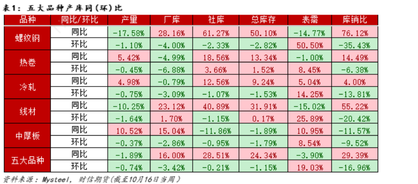 样本钢厂盈利率延续下降,但钢厂主动减产意愿较低,铁水产量延续高位回落态势,但下降幅度相对较小。据Mysteel调研,截止10月16日,247家样本钢厂日均铁水产量为240.95万吨,环比下降0.59万吨,连续三周下降(累计下降1.41万吨);样本钢企盈利率为55.41%,环比下降0.87个百分点,连续10周下滑。从粗钢调控角度来看,行政压产的概率相对较小。据国家统计局数据,1-9月粗钢产量累计同比下降2.9%(折2228万吨),考虑到铁水产量仍有下降空间,后期钢材调产更多基于利润或环保影响。