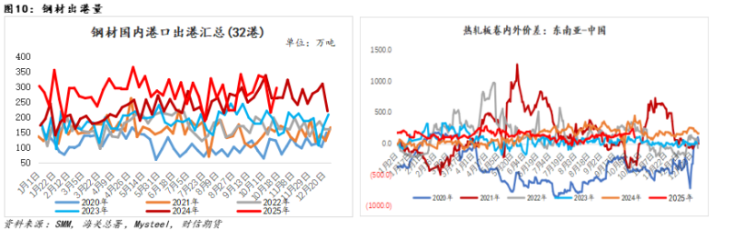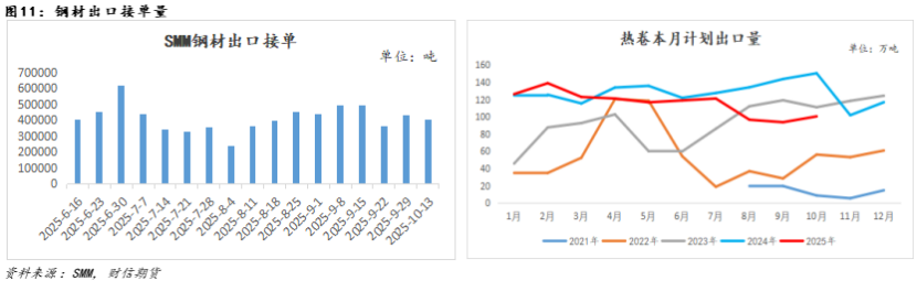 从钢材直接出口角度来看,钢材出港量环比回升,但以热卷为代表的板材内外价差收窄,出口动能或有所减弱,短期钢材出口量或维持弱稳。据SMM,25年第42周,32港钢材出港量为296.81万吨,环比增加81.01万吨。从内外价差来看,截止10月17日,热卷内外价差收窄至99.7元/吨,环比下降73元/吨。综合内外价差、热卷计划出口量与钢材出口接单量,短期钢材出港量或变动不大。