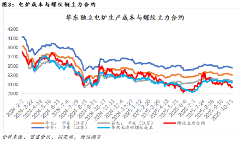 从静态估值来看,螺纹钢主力01合约全面跌破钢厂螺纹生产成本态势未改,静态估值中性略低。据富宝资讯,截止10月17日,华东独立电炉平电生产成本在3300元/吨,华东独立电炉谷电生产成本在3170元/吨(各地区谷电平均平均成本在3151元/吨),华东长流程螺纹钢生产成本在3153元/吨。钢材需求驱动整体不足(建材旺季需求高度或有限,建材需求或于月底见顶),市场对螺纹盘面定价不高于华东独立电炉谷电生产成本,需求悲观预期下,短期华东长流程螺纹成本或是螺纹钢01合约压力位所在。