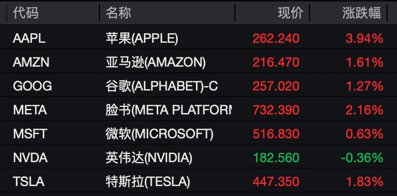 大型科技股普涨,苹果涨近4%,创历史新高;Meta涨超2%,特斯拉、谷歌、亚马逊涨逾1%,微软小幅上涨;英伟达小幅下跌。