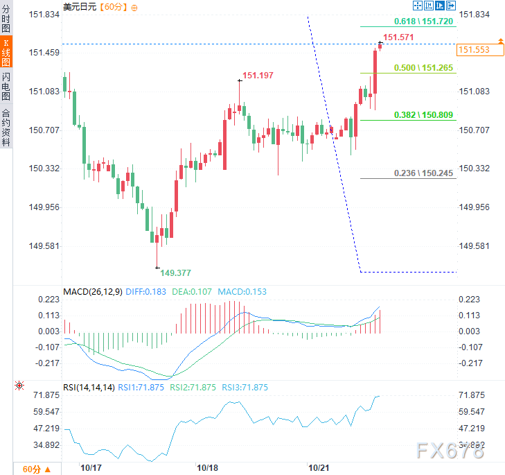 美元兑日元在逢低买盘推动下重返151关口上方,多头重掌主动权。小时图技术指标偏向多头态势。