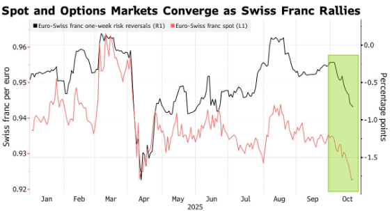 期权交易数据突显了这一需求情况。来自存托信托与清算公司的数据显示,周五欧元兑瑞士法郎的交易量达到了自8月以来的最高水平,而美元兑瑞士法郎的交易量则达到了一个月来的最高值。