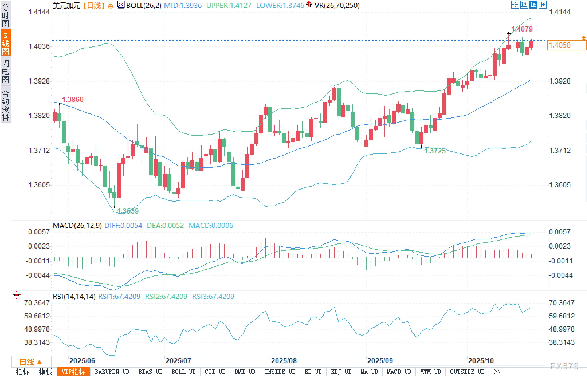 汇通财经APP讯——周二(10月21日),美元兑加元汇价在欧洲时段延续走强,盘中交投靠近1.4050。市场把焦点对准今晚20:30公布的加拿大通胀与加拿大央行十月议息前景,叠加原油续跌与北美财政不确定性,短线波动率处于易涨难跌的“强趋势—数据敏感”阶段。