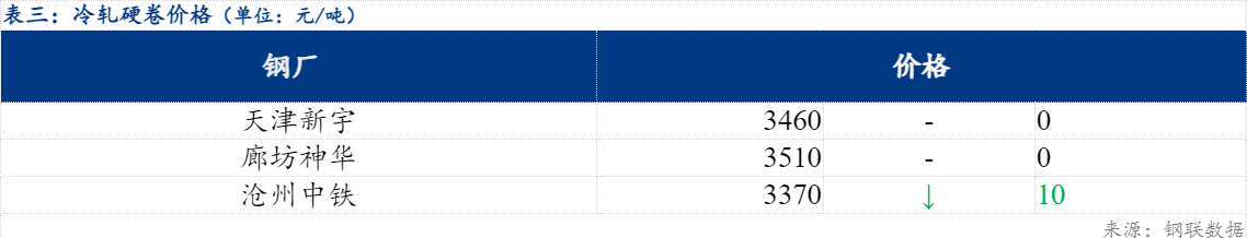 今日北方市场冷轧基料3.0*1010*CSPHC河北普阳价格为3210元/吨,较上一期价格持稳,河北纵横价格为3200元/吨,较上一期价格下跌10元/吨。镀锌方面,今日北方市场价格维持弱稳运行;轧硬方面,当前主流报价3370-3510元/吨。市场方面,仓库库存数据依旧较大,加上需求表现较弱,贸易商操作上仍以出货保成交为主,北方大户日成交300吨。