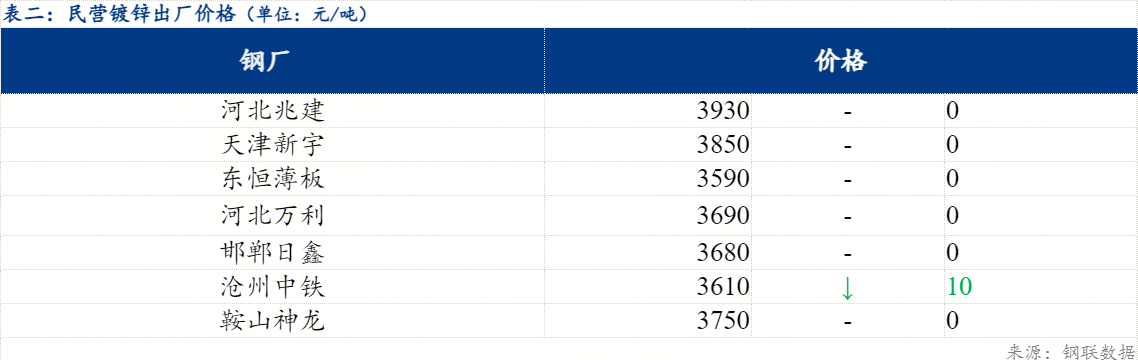 今日北方民营钢厂镀锌出厂指导价在3590-3930元/吨。