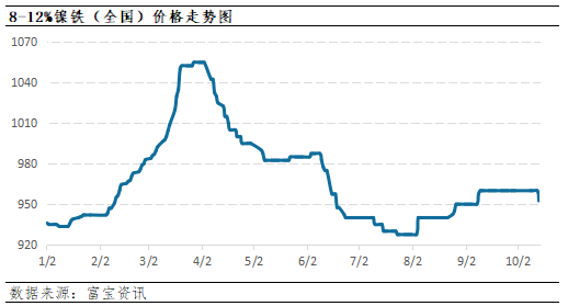 尽管印尼政府有意稳定镍价,并已暂停部分矿企开采活动以提振市场情绪,但下游不锈钢成交反馈不佳,钢厂迫于生产和消费压力,在原料采购上持谨慎态度。最新镍铁成交价已出现小幅回调,10月10日华南某钢厂高镍铁采购成交价格较此前下滑10元/吨,降至945元/吨(舱底含税)。