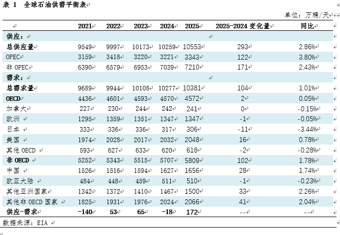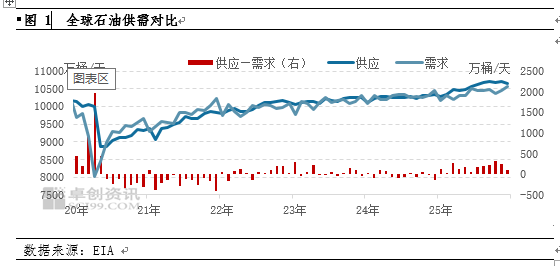 近几年,供应端主要受欧佩克+减产联盟的产量调控政策影响,需求则受到美联储货币政策和全球经济周期的影响。2021年,供需缺口最高达到140万桶/日,2022年和2023年整体保持小幅过剩累库,2024年保持小幅去库,2025年过剩量高达172万桶/天。