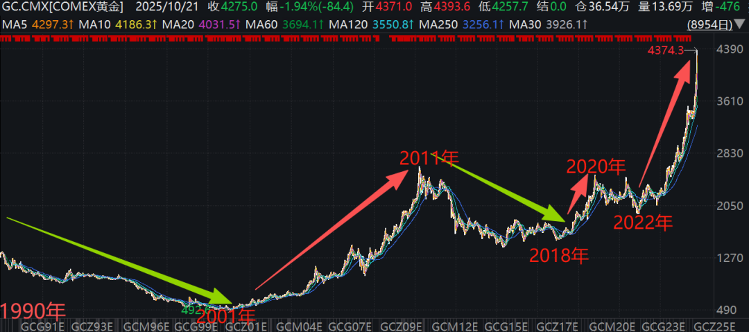 只不过,黄金的每一轮周期比较长,开启上涨或者下跌后,往往都能持续十年这样的长度。我们不论是从2018年算起,还是从2022年算起,到现在都没有十年。