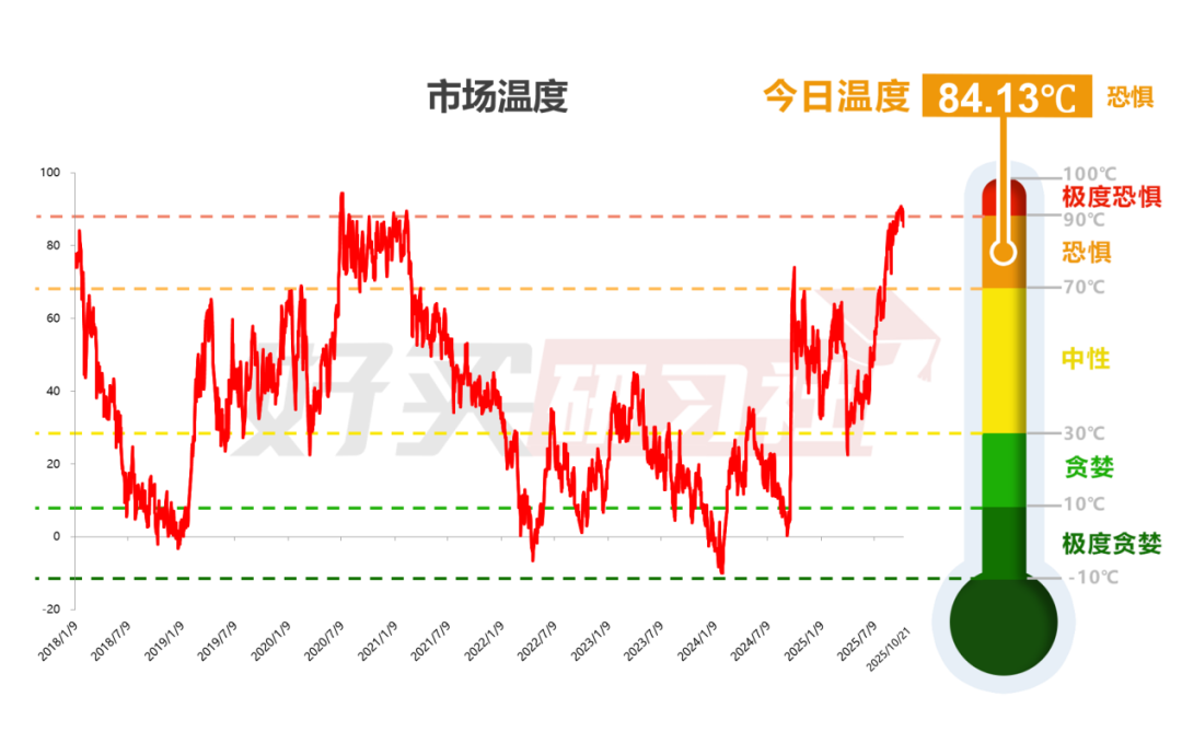 随着近期的上涨,今天的市场温度已经到了84.13℃,处在恐惧区间。偏谨慎的投资者,或者仓位太重的投资者,可以考虑适当减仓。其他投资者守好仓位即可。