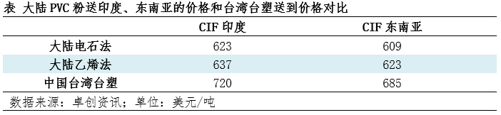 从价格对比来看,大陆PVC出口至印度、东南亚地区的价格优势较为明显,不排除台湾台塑的价格包含印度反倾销税的计价。但跟其他地区货源做价格对比,大陆以及台湾的价格都不具备优势。据了解其他国际市场价格,日本某货源送到东南亚地区的价格在605美元/吨,美国货源送到东南亚地区的价格在580-590美元/吨。以上因素是导致出口仅出现好转但未能放量的原因。