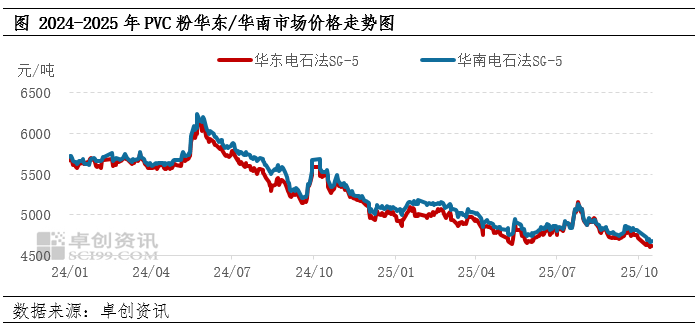 截至10月16日,PVC粉华东SG-5主流4560-4670元/吨,较9月30日均价下调75元/吨。中美关税博弈扰动造成的宏观氛围偏弱影响市场情绪,同时节后PVC整体库存压力较大,带动价格下行。