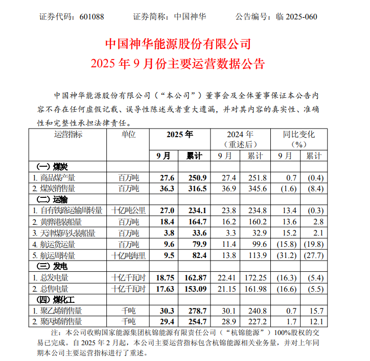 2025年9月,本公司自有铁路运输周转量同比增长的主要原因,是自有铁路沿线煤源充足带来铁路运量增加;黄骅港装船量、天津煤码头装船量同比增长的主要原因,是到港资源量增加及上年同期基数较低;航运货运量及周转量同比下降的主要原因,是业务结构调整、航线结构变化;总发电量、总售电量同比下降的主要原因,是受天气影响部分区域用电需求不足、新能源出力增加等。