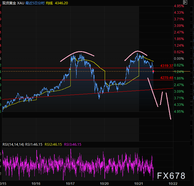 现货黄金分时图显示,4319是强弱分水岭目前现货黄金走势开始走弱,4270是现货黄金日线级别的5日线附近以及多头的重要防线,如果4270支撑不住则现货黄金可能跌破4235附近从而导致双顶的可能。目前4319是第一压力位,如果涨过则双头压力暂时可以化解。