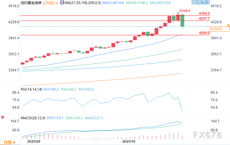 从技术面来看,12月黄金期货多头仍在短期整体走势中占据技术优势。多头的下一个上行目标是推动价格收于关键阻力位——合约历史高点4398美元上方。空头的短期下行目标则是将期货价格压至4000美元这一关键技术支撑位下方。