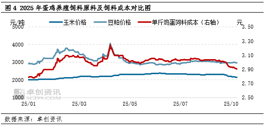 如图1所示,2025年9月蛋鸡养殖实现单斤鸡蛋0.26元盈利,较8月均值提升0.44元,成功扭转近4月的亏损局面,但其盈利周期极为短暂。进入10月受鸡蛋价格大幅下挫与饲料成本微降的双重挤压,养殖利润迅速转负。根据卓创资讯监测数据显示,10月1-16日单斤鸡蛋由盈利0.15元迅速转为亏损0.22元,累计下降幅度0.39元。
