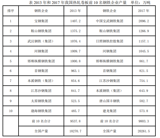 2、从钢厂来看,从 2013 年到 2017 年,我国热轧卷板(商品材)前 10 名的钢厂所占国 内产量的比例总体在下降。2017 年前 10 名钢铁企业热轧卷板(商品材)产量 9803.3 万吨, 占国内产量的 48.4%,较 2013 年下降 3.8%,值得注意的是,宝武集团已经完成合并,后期企 业兼并重组或将延续,未来我国热轧行业前十企业集中度有望逐步提升。