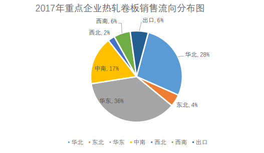从消费区域看,据中钢协数据显示,华东地区为我国最大的热轧卷板消费地区。2017 年 重点企业热轧产量为 1.39 亿吨,其中流向华东地区 5057 万吨,占统计总量的 36%;流向华北 地区 3812 万吨,占统计总量的 28%;流向中南地区 2361 万吨,占统计总量的 17%;流向海 外、西南、东北、西北地区分别占到统计总量的 6%、6%、4%以及 2%。
