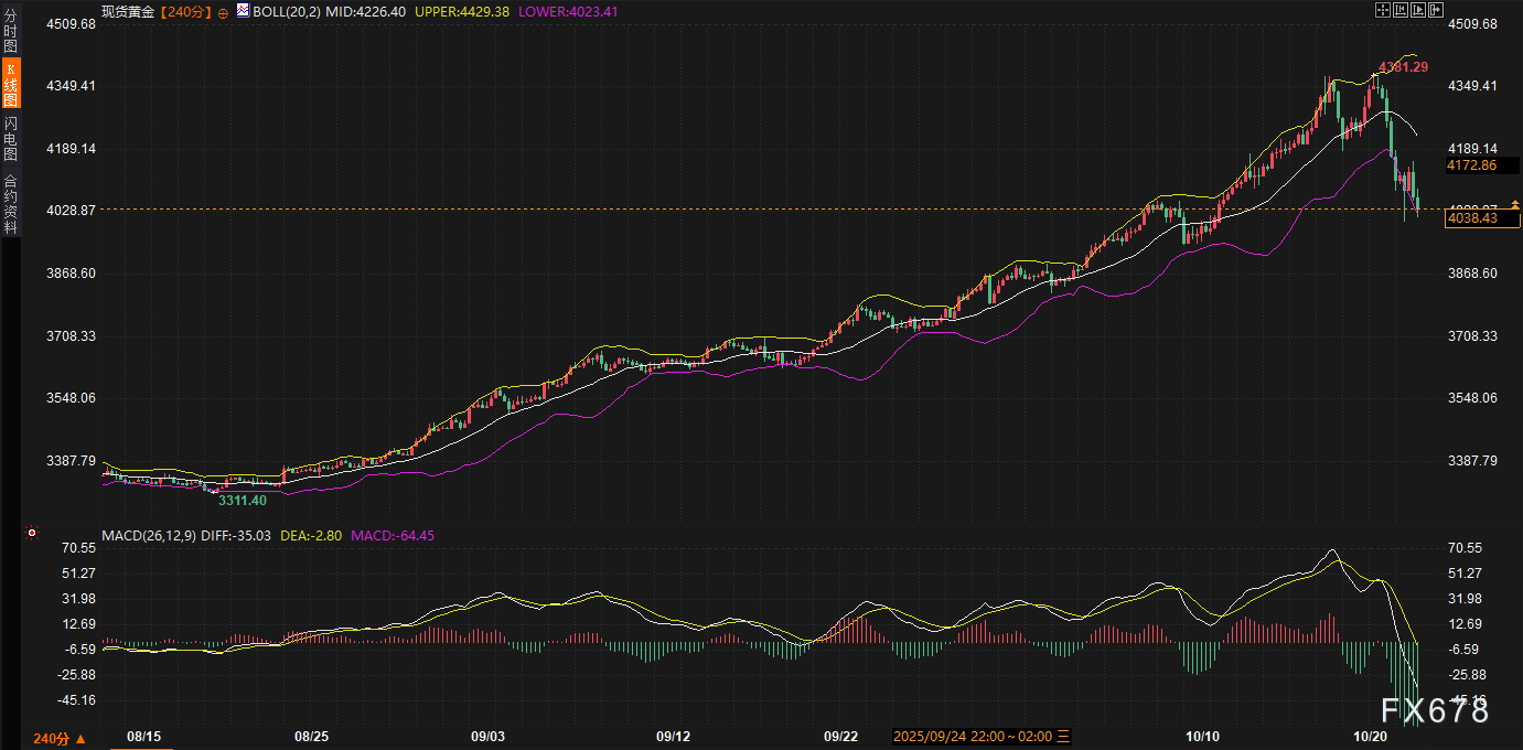 现货黄金的急挫构成了周三市场的另一焦点,从近期高点累计9%的回落,直接将价格拖至4040.54美元/盎司附近,这一幅度远超同期美元的微动,凸显债市信号对避险效应的逆向传导。不同于传统美元-黄金负相关,此次调整更多源于债市低收益率的“挤出”作用:当10年期收益率守住3.95%低位,投资者对QT结束的乐观预期削弱了黄金作为非收益率资产的吸引力,导致多头仓位加速平仓。240分钟图上,布林带中轨4226.47已成为遥远的阻力,上轨4429.23更显虚幻,而下轨4023.76已近在咫尺,价格日内2.04%的跌幅正测试这一下沿支撑。