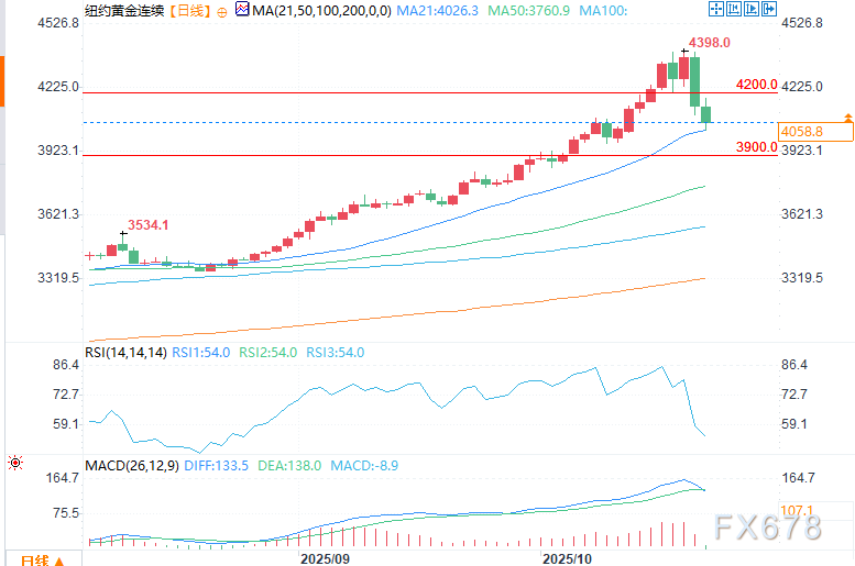 从技术面来看,12月黄金期货的多头势力正迅速减弱。多头的下一个上行目标是推动期货价格收于4200.00美元的关键阻力位上方;空头的下一个短期下行目标是将期货价格压至3900.00美元的关键技术支撑位下方。第一阻力位见于4100.00美元,进一步阻力位为隔夜高点4175.00美元;第一支撑位见于隔夜低点4021.20美元,进一步支撑位为4000.00美元。