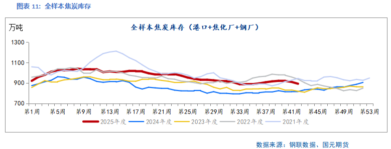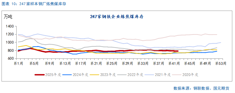 上周,247家钢厂焦炭库存为639.44万吨,周环比下降1.75%;270家独立焦化厂焦炭库存为57.29万吨,周环比下降10.26%;港口焦炭库存为195.15万吨,周环比增加0.03%。