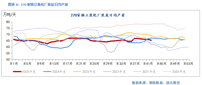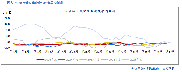 上周,230家样本独立焦化厂焦炭日均产量为52.18万吨/天,周环比下降1.29%;270家样本独立焦化厂焦炭日均产量为65.29万吨/天,周环比下降1.26%;247家钢厂焦化厂日均产量45.94万吨/天,周环比下降0.95%。独立焦化厂吨焦利润为-13.0元/吨,周环比下降22.0元/吨。