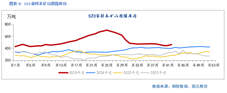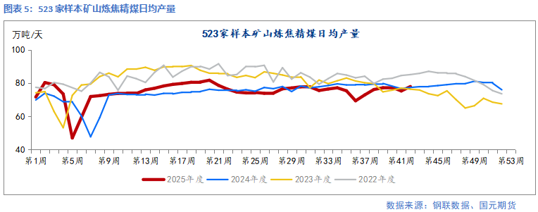 上周,523家炼焦煤矿山开工率为87.33%,周环比增加5.44个百分点;原煤日均产量为196.07万吨/天,周环比增加6.64%;精煤日均产量为77.9万吨/天,周环比增加3.55%。