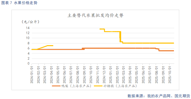 随着社会发展水平的提高,居民对水果品类的选择日趋多样化,稀释了苹果单品消费的能力。而苹果受时令水果的替代性较强。其中柑橘类、梨的生长周期与苹果相近,和苹果的替代关系最强。截至10月21日,上海农产品市场鸭梨批发均价为5元/公斤,较上周环比持平。上海农产品市场砂糖橘批发均价为8元/公斤,较上周环比持平。夏季水果基本退市,秋冬季水果陆续上市。受今年北方气候的不利影响,梨类遇到类似苹果的情况,好货供应紧张,不过在管理技术提升的背景下,整体产量依然充裕。而柑橘类作为我国产量第一的水果品类,今年延续增长势头。柑橘、梨类的上市期与苹果重合,且同为大宗水果,对苹果消费形成压制。关注柑橘、梨类后续价格走势。