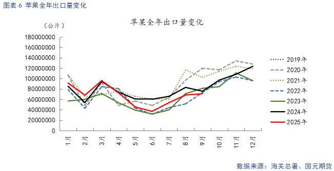 据海关总署数据显示,截至2025年9月,我国苹果当月出口量为7.08万吨,较8月环比增加16.4%,较去年同期减少26.86%。我国苹果出口的传统旺季集中在每年四季度至次年一季度。24/25果季开秤价较低,保持了价格优势,25年1-3月份。出口同比大幅增加。进入4月后,经过前期持续出库,冷库剩余库存量已明显减少,可供出口的货源相对有限。加之低库存支撑下,苹果价格明显上涨,出口竞争力有所削弱。苹果出口呈现明显季节性回落态势,并在6月跌至历史偏低水平。7月后,早熟陆续上市,出口环比大幅恢复,但整体仍远低于去年同期水平。待10月新果下树,货源供应逐步充足,将进入传统出口旺季,出口量有望延续环比增加势头。