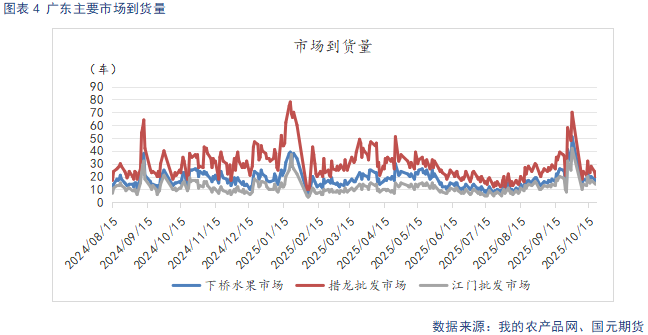 钢联数据统计,截至10月14日,洛川70#以上半商品价格3.7-4.2元/斤;白水70#以上半商品均价3.5元/斤;静宁70#以上统货价格4-4.5元/斤;山东毕郭市场晚熟富士统货主流参考价2.5-3元/斤。截至10月13日,广东主要批发市场日均到货量为17车,较节前峰值下降37车。今年晚熟上市推迟,加之商品率偏低,当前好货供给相对偏紧,收购前期的价格将维持高位。当前正处收购前期,产区报价浮动较大,但整体来看,较去年同期上涨0.5-1元/斤。冷库旧季余果受新果冲击,价格走弱。随着供给逐步增量,关注后续收购价变化及入库进度。