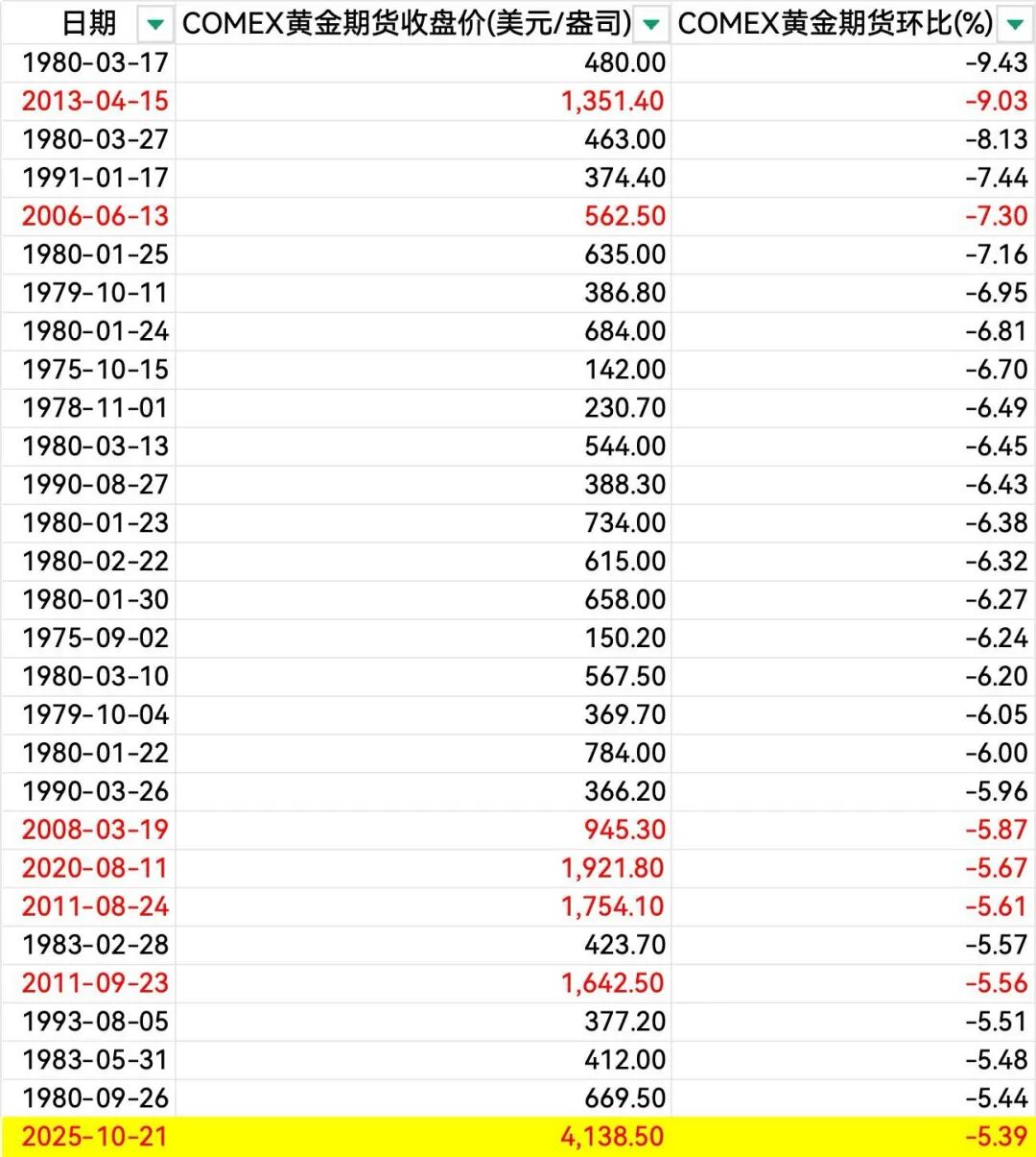 即使从本世纪初开始算起,这样的惊魂时刻也寥寥无几。2000年以来单日跌幅超过2025年10月21日的只有6个交易日。比如,2013年4月15日的单日跌幅为9.03%,2006年6月13日的单日跌幅为7.30%。