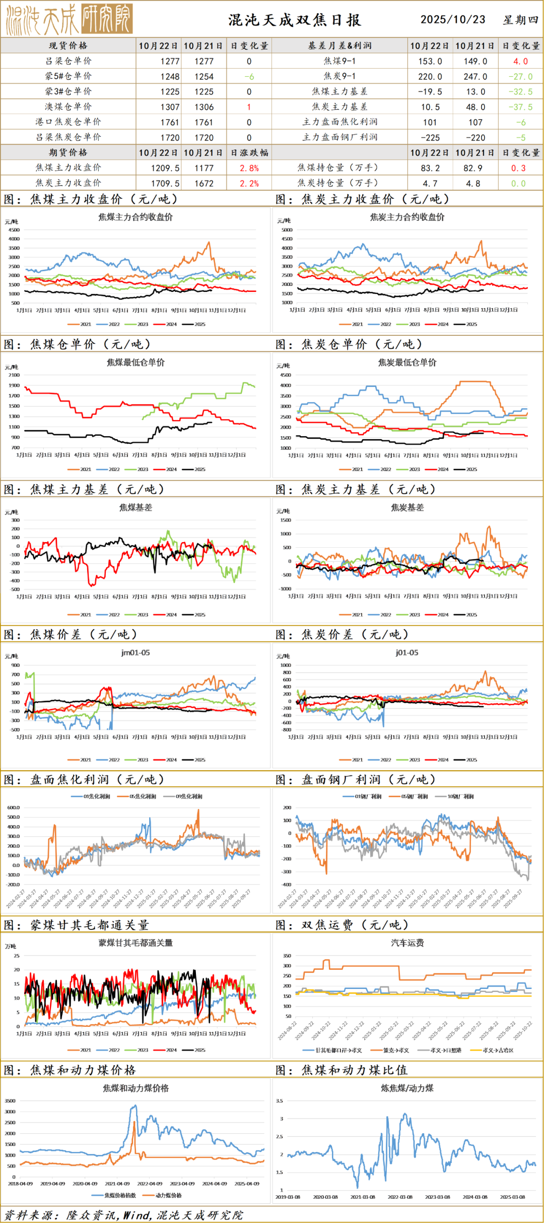2.中国煤炭资源网冶金部10月22日重点关注:焦炭方面,当前焦煤供应略显偏紧,煤价整体上行,焦炭利润受到挤压,叠加部分企业有检修行为,供应有小幅回落,而需求端由于部分钢厂原料库存偏低,对焦炭采购较为积极,焦企出货顺畅,场内库存有限,综合影响本轮提涨落地预期增强,不过,当前钢价维持下行趋势,整体利润不佳,部分品种已在亏损状态,铁水产量有下行预期,焦炭暂时维持稳定运行,后期需关注原料煤价格及钢材销售情况。焦煤方面,近日内蒙及山西地区煤矿因环保及搬迁工作面等因素生产受限,整体供应再度收缩。下游焦企维持按需补库,煤矿销售顺畅,部分预售订单在半月左右,优质主焦及瘦煤价格高位继续上探,竞拍成交涨势可观,矿方基本无库存,焦煤供需延续偏紧格局,支撑煤价稳中上涨。进口蒙煤方面,受昨日期货盘面下跌影响,口岸市场交投氛围有所转弱,蒙5原煤部分成交回落至1100元/吨左右。