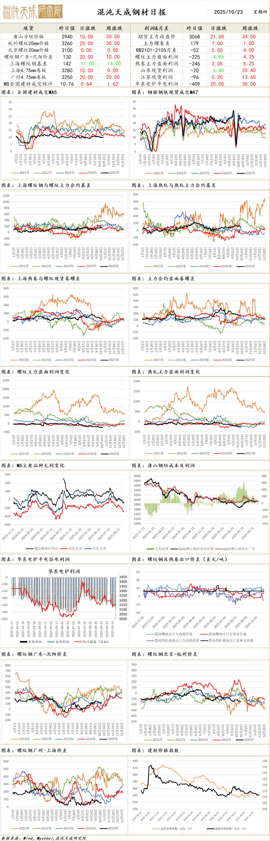 需求端,周一钢银城市钢材库存略有下降,其中建材库存减少,但热卷库存有增。昨日找钢厂库、社库均有下降,总库存有所减少,其中建材库存降幅较板材更大,且各品种钢材表需均有回升。另据百年建筑调研,本周全国水泥出库量261.6万吨,环比上升3.5%,基建水泥直供量环比上升1.9%;混凝土发运量为144.87万方,环比减少3.21%;样本建筑工地资金到位率59.62%,周环比上升0.18个百分点,显示当前建筑下游需求依然喜忧参半。海外方面,尽管美国政府停摆延续,但随着中美博弈有缓和迹象,叠加俄乌也有望迎来和谈,近日贵金属大幅回落,但外盘商品波动依然较大。国内方面,9月数显示国内地产基建依然较差,制造业投资也有所走弱,但出口和消费保持韧性,三季度4.8%的GDP基本符合预期,不过与黑色相关的地产、制造业需求均偏弱。进出口方面,昨日国外主要地区钢价普遍持稳,近期国内外冷热卷价差小幅扩大,国内钢材出口空间趋增。