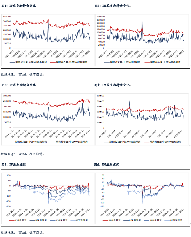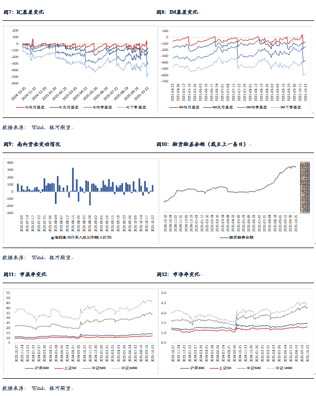 股指期货全线回落,至收盘,主力合约IH2512跌0.06%,IF2512跌0.46%,IC2512跌0.8%,IM2512跌0.5%。除IH外,各品种贴水有所收敛。IM、IC、IF和IH成交分别下降21.8%、25%、20.8%和11.9%,持仓分别下降3.8%、5.1%、3.7%和3.1%。