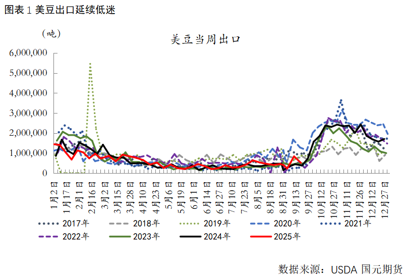 尽管 8 月中美达成 90 天关税暂停协议(保留 10% 基础关税),但十一期间特朗普政府未释放进一步降税信号。另外,特朗普周末在个人社交媒体突然宣布计划从11月1日对华加征100%关税,此举可能是为了报复中国交通部上周公布对美反制征收港口费细则。如果特朗普最终落地,11月1 日美国将累计对华加征130%关税(10%基准关税、20%芬太尼、100%新增),此外24%对等关税90天豁免期也即将在11月10日到期。该举若落地将进一步加剧美国出口销售困境。假期期间市场担忧 90 天暂停期结束后关税回升,中国进口商继续规避美豆采购,导致美豆出口销售数据停滞(USDA 数据因停摆未发布)。