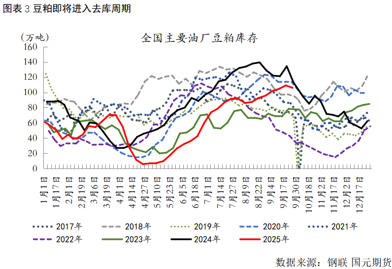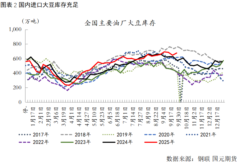 2025年三季度国内主要油厂开机率及压榨量维持同期高位,高压榨主要得益于充足的进口大豆供应,同时,虽然豆粕产出增加,但由于生猪去产能进度相对一般,整体饲料下游需求尚可,累库速度并不快。不过对于后市,尽管双节备货需求对豆粕消费形成一定支撑,但高压榨仍导致豆粕库存持续积累。短期来看,充足的原料供给将继续支撑油厂高开机率,但需密切关注下游豆粕提货及库存变化对压榨节奏的潜在影响。国庆节假期期间,2025年第39周库存数据停更一周。回顾38周,全国油厂大豆库存小幅下调至694.66万吨,较上周减少38.54万吨,减幅5.26%,同比去年增加7.04万吨,增幅1.02%,同比差距缩小。当周大豆到港量201.5万吨,较前一周大幅减少。39周油厂大豆压榨量为175.57万吨,因迈入国庆假期,大部分油厂按照计划停机。