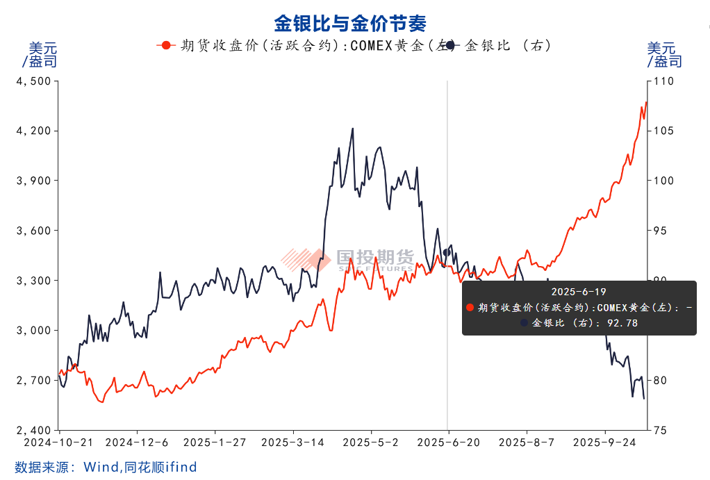 年内金银比给出经典交易机会。年中我们看到Taco交易开始在海外市场流行,国内外商品和权益市场经历清明假期的关税战冲击后低位企稳。美国政府在5月中旬以来动作频频,包括日内瓦协议,中美元首通话,总统与马斯克矛盾显性化,大美丽法案,体现的是财政扩张和阶段性妥协的倾向,并对美联储施压要求降息。基于其政策的延续性和市场风险偏好的改善倾向,金银比对于国际游资来说是风险偏好改善的核心交易工具。在清晰的宏观驱动引导下,金银比从最高100之上的水平快速回归,最低跌破80。