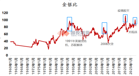 市场对风险的感知也会影响金银比。在市场不确定性增加时,投资者可能会寻求黄金作为避险资产,推高金银比。而在市场情绪稳定时,白银可能会因其工业用途而受到青睐,导致金银比下降。极端风险情境下,市场出现过避险情绪下的流动性冲击,这种状态下往往会助长金银比抬升。流动性冲击阶段,黄金由于流动性需求被抛售,白银更甚。(2008、2020年、2025年4月)