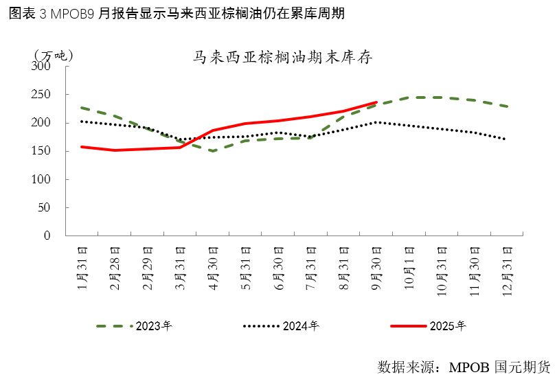 马来西亚棕榈油局(MPOB)9 月供需报告超预期利空,整体表现为产量略降、出口疲软、库存超预期累积格局,对棕榈油市场形成阶段性利空压力,但长期受季节性减产周期及政策支撑,价格有望震荡修复。具体来看,本次报告显示马棕9月产量小幅下降,但仍高于预期。9 月棕榈油产量环比减少 0.73% 至 184.12 万吨,主要受马来半岛单产下滑 3.14% 拖累,但沙巴和沙捞越地区因降雨改善实现增产。尽管市场预期减产,但实际产量仍高于机构预测的 179 万 - 181 万吨,反映出产区整体供应韧性。需求端来看,马棕出口疲软与国内消费收缩并存。其中出口量环比仅增 7.7% 至 142.8 万吨,低于市场预期的 145 万 - 150 万吨,主要因中国买船衔接不畅及印度转向豆油采购。国内消费同比锐减 33.2% 至 33.35 万吨,或与斋月后需求回落及生物柴油掺混政策执行放缓有关。综合来看,马棕库存超预期累积,供需格局维持宽松。马棕月末库存环比激增 7.2% 至 236.1 万吨,远超市场预期的 215 万 - 220 万吨,创 2024 年 12 月以来新高。标志着马棕市场从8月报告给出的供需紧平衡转向宽松。