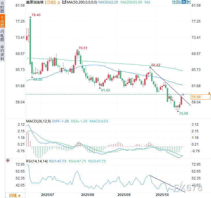 上行方面,鉴于此前出现的看涨技术信号与利好消息面,若油价有效突破60.50美元阻力,下一目标位可看至62.20美元附近(与50日移动平均线重合),后续目标可关注10月高点63美元、65美元阻力位,或关键的200日移动平均线(65.60)。